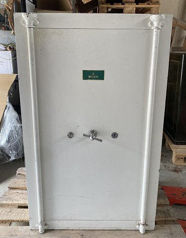 Pengeskab fra Knud Pedersen af hvidlakeret metal, indvendigt grønlakeret. H. 120 cm. B. 74 cm. D. 60 cm. Vægt: ca. 400 kilo. Fremstår med brugsspor, heraf rust indvendigt. Nøgle medfølger. Køber står selv for håndtering ved afhentning. Mulighed for transport kan evt. arrangeres af os.