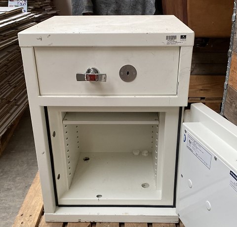 Howeni Eurosafe - Mindre pengeskab af metal. H. 78 cm. B. 56,5 cm. D. 57 cm. Vægt: ca. 400 kg. Fremstår med brugsspor. Nøgler medfølger. Køber står selv for håndtering ved afhentning. Mulighed for transport kan evt. arrangeres af os.