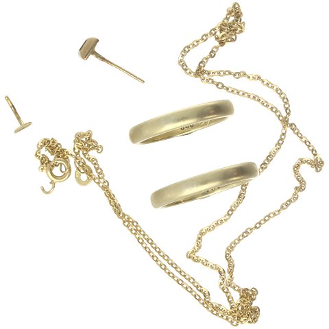 Defekt halskæde af guld 14kt - par vielsesringe af hhv. 14 og 18kt. - defekt del af guld 8kt. - ørestikker af guld 8kt.