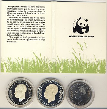Tanzania, 25 + 50 Shilingi 1974 sølv, desuden 100 Shilingi 1986 i samlemappe.