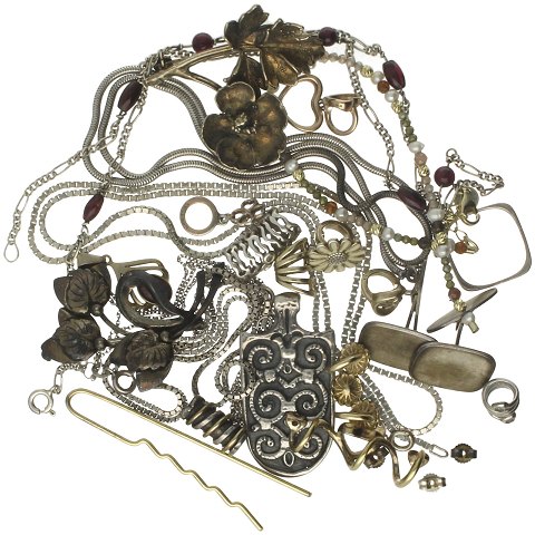 1 armbånd - 1 fingerring - 2 brocher - 3 bagmekanikker til ørestikker - 1 slipsenål - 1 par manchetknapper - 5 halskæder - 12 charms/vedhæng.