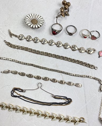 En samling diverse sølvsmykker bestående af: en bismarck armlænke, fire diverse armlænker bl.a. et hjertearmbånd, en Anton Michelsen marguerit broche, en halskæde med vedhæng, en forgyldt sommerfugle armlænke samt et lille hjerte.