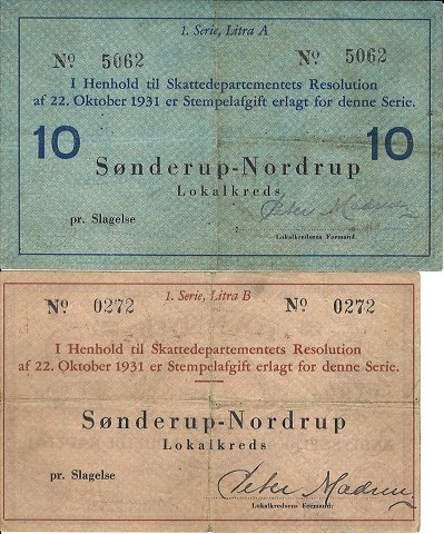 J.A.K sedler - 5+10 kroner 1931 - Sønderup-Nordrup - Sieg 5+6 - 2 stk