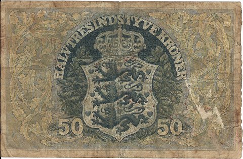 Overtrykt på 50 kroner 1938 C (Svendsen/Sander).
