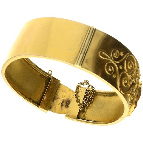 Oplukkelig armring af forgyldt metal fattet med gul sten.