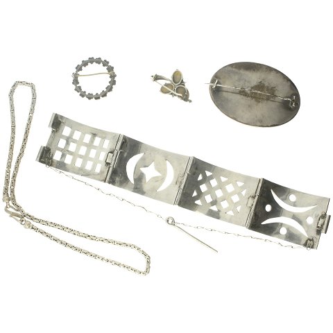 1 halskæde - 3 brocher - 1 oplukkelig armring.