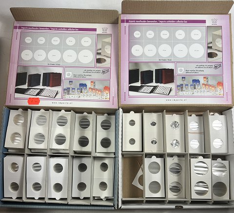 En samling møntholdere i varierende størrelser, bl.a. Ø. 20 og 25 mm. Fremstår i original emballage.