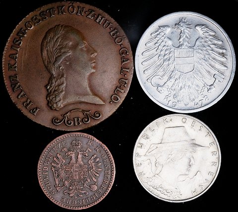 Lot, Østrig - Ungarn - 3 kreutzer (1812) - 10 groschen (1925) - 1 kreuzer (1858) - 1 Schilling (1947)