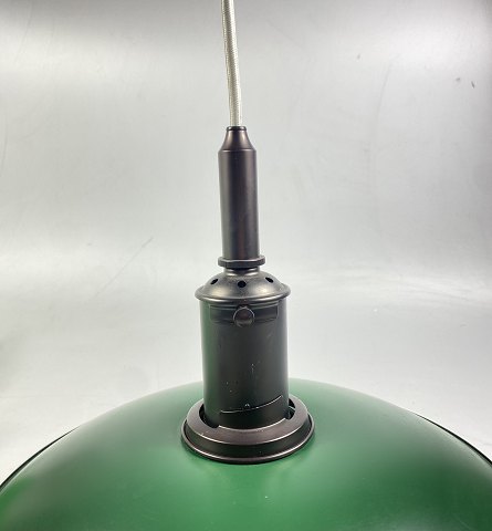 Poul Henningsen - PH 3½-3 pendel med skærme af grønlakeret metal med hvid omrulning, indvendigt hvidlakeret. Bajonetfatning af silkemat brun kobber. Udført hos Louis Poulsen. Ø. 33 cm. Fremstår i pæn stand, afkortet ledning.