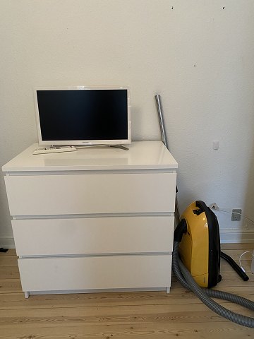 To plakater, to litografier, Samsung TV, Ikea kommode, Ikea tøjskab, Ikea reol, skrivebord af egetræ (dette med skjolder), en seng, et undendørs cafébord, en rispapirs pendel, fem reoler af træ, to standerlamper, en sovesofa, et spisebord af bøgetræ samt diverse køkkenredskaber og en del løsøre i form af porcelæn og glas.