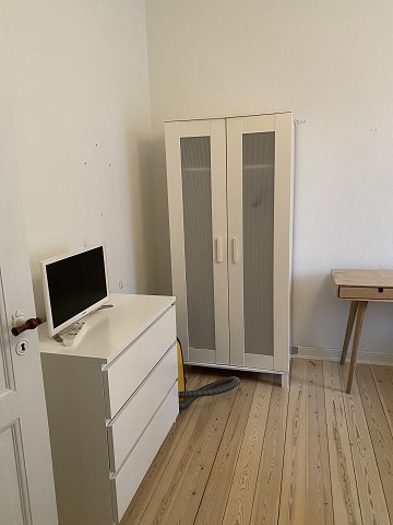 To plakater, to litografier, Samsung TV, Ikea kommode, Ikea tøjskab, Ikea reol, skrivebord af egetræ (dette med skjolder), en seng, et undendørs cafébord, en rispapirs pendel, fem reoler af træ, to standerlamper, en sovesofa, et spisebord af bøgetræ samt diverse køkkenredskaber og en del løsøre i form af porcelæn og glas.