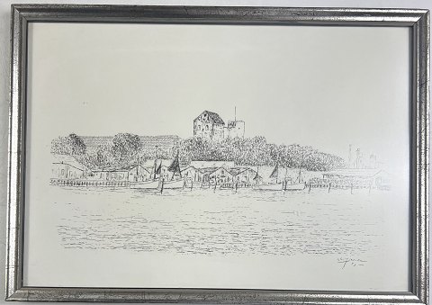 Fem sort / hvid tryk med skibs- og bymotiver. Fremstår indrammet.