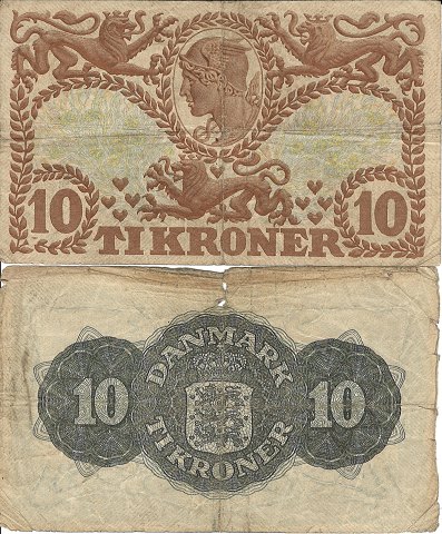 Par danske pengesedler - 10 kroner - 1941 - Q - Sieg 105 - DOP 124 - Pick 31 / 10 kroner - 1945 - B - Sieg 121 - DOP 130 - Pick 37a-d
