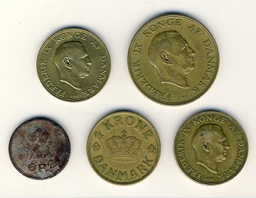 2 øre 1913 (dårlig) samt 1 krone 1935, 54, 59. 2 kr 1959.