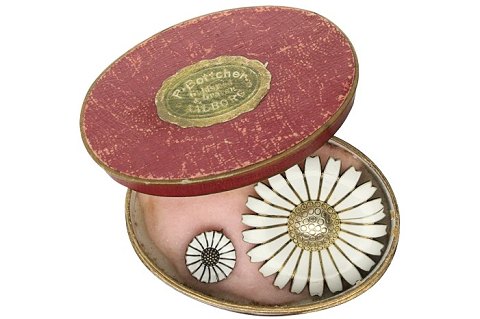 Anton Michelsen - to marguerit brocher af forgyldt sterlingsølv med emalje