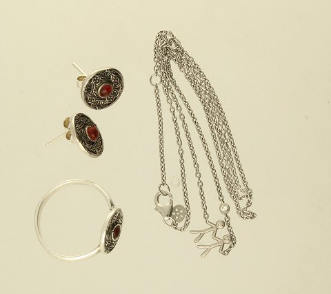 En samling sølvsmykker bestående af: En halskæde, L. 45 cm. En ring, str. 60. Samt et par ørestikker. Samlet vægt: ca. 9,63 gr.
