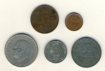 Norway 1 øre 1965, 5 kr 1963. Finland 5 penniä 1897. Serbia dinar 1942, 10 dinara 1943