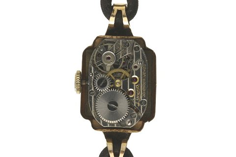 Uret har en 16x35mm kasse af guld 18kt. kassen er monteret på en tekstil rem afsluttet med c-spænde af metal. Uret har en sølvfarvet skive med arabertal. Uret er udstyret med et mekanisk værk med manuelt optræk.