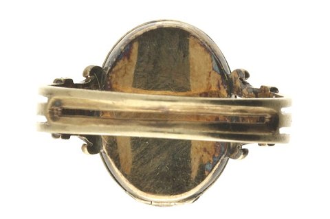 Ring med fotogemme af guld, formodentlig 8kt. fattet med mørk sten