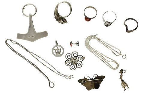 4 ringe - 2 brocher - 3 vedhæng - 2 kæder - enkelt ørestik.