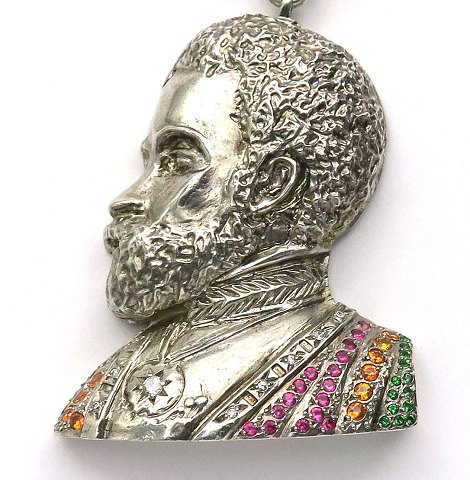 Vedhæng af sterling sølv, udformet som portræt af den tidligere etiopiske Keiser Haile Selassie. Krave prydet med rækker af grønne, orange, røde og klare, facetslebne sten, symboliserende det etiopiske flag. H. 60 mm., vægt ca. 59 gr.