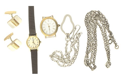 To armbåndsure - to par manchetknapper hvoraf det ene er af sterlingsølv, to kæder, et par ørestikker af sterlingsølv med perler.