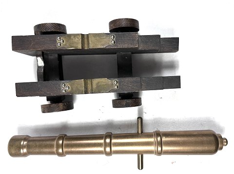 Kanon af bronze på lavet af mørkbejdset eg.