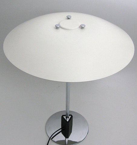 PH 4/3 bordlampe med hvid, vådlakeret overskærm, stamme og fod af forkromet metal. Overskærm diameter 44 cm., H. 57 cm.