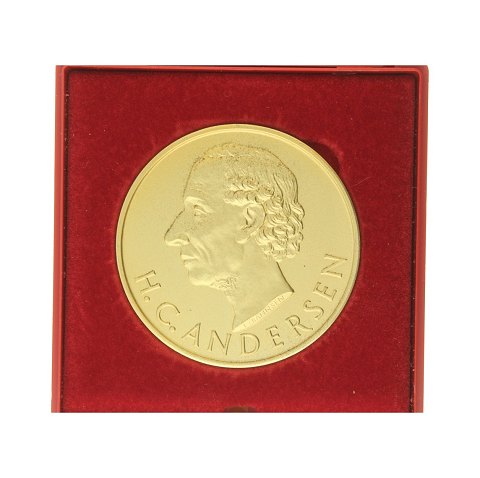 Limiteret H.C. Andersen medaille af forgyldt metal, præget i kun 5000 eksemplarer i anledning af H.C. Andersens 100 års dag 1805-1875-1975, diameter 55 mm.