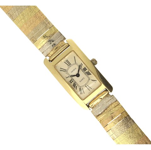 Uret har en 19x34mm kasse af guld 14kt. kassen er monteret på en lænke af trefarvet guld, formodentlig 14kt. Uret har en hvid skive med romertal. Uret er udstyret med et quartz værk.