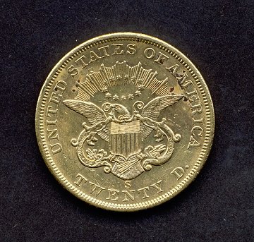 Den første type af de amerikanske double eagles perioden 1849-76. Her er der tale om et af årene fra borgerkrigen som er meget efterspurgte også i andre sammenhænge end blandt møntsamlere. Når der så samtidig er tale om et lille oplag er det forventeligt at mønten koster mere end normalt. Kun præget i 854.173 eksemplarer!