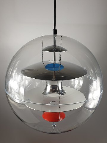 VP Globen er designet af Verner Panton tilbage i 1969. Pendlen består af en transparent akryl skærm, med indvendig lakering i hvid, rød og blå.