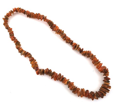 Rav halskæde med delvist uslebne ravstykker i forløb.