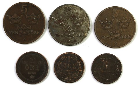 Gustav V 5 øre 2x 1909 og 1918, Oscar II 2 øre 1904 og Carl XV 1 øre 1862 og 1870.