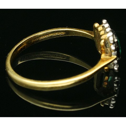 Ring udført af 14 kt. guld, fattet med en smaragd omkredset af 16 diamanter på ca. 0.01 ct. Ringstr: 61. Vægt: ca. 3,13 gr.