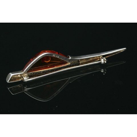 Broche udført af sterling sølv, fattet med rav. Længde: ca. 7,3 cm. Vægt: ca. 8,28 gr.