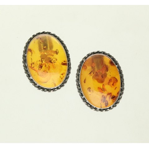 Smykkesæt af forsølvet metal fattet med rav. Længde på kæde: 45 cm. Vægt: ca. 19,5 gr.