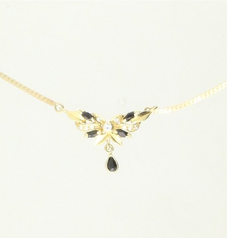 Halskæde udført af 14 kt. guld, vedhæng fattet med klare og blå sten. Længde: ca. 42 cm. Vægt: ca. 6,33 gr.