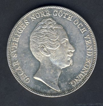 Oscar 1, 1 rigsdaler specie, 1854 - utroligt nydeligt eksemplar, med masser af møntskær. Specier af denne kvalitet må betegnes som vanskelige at opdrive, samtidig er dette året med det laveste oplag for typen, dette er på 33.671 stk