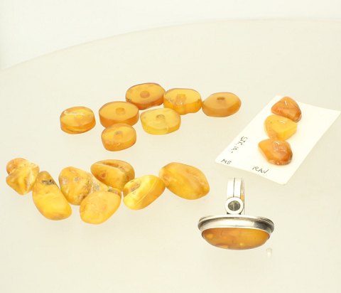 En samling diverse smykker bestående af: Ring af sølv fattet med rav, str. 54. Enigma de Sultán puzzle ring af sølv, str. 56 (reperation på ringskinne). Denne i smykkeæske i form af kiste / skrin. Tre brocher.