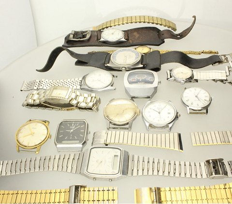 En samling diverse armbåndsure bestående af bl.a.: Tisot, Kienzle, Bulova accutron, Inex, Timex. Diverse urskiver bl.a.: Sicura, Casio, Inex, Alpina. Samt diverse reservedele i form af urlænker.