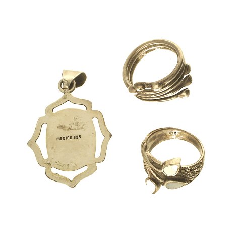 En samling diverse smykker bestående af: To ringe af sterling sølv, str. 56 og 58. Vedhæng af sterling sølv fattet med sort sten. Samt to armringe.