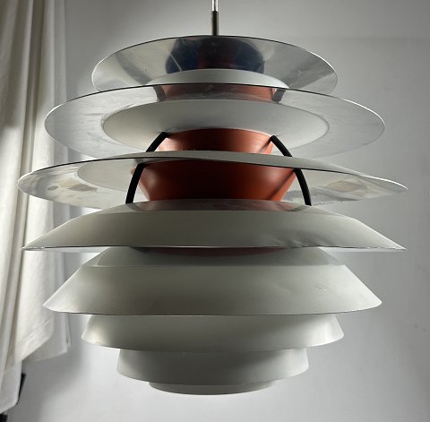 PH Kontrast, loftpendel med 10 forskelligt profilerede skærmringe og justerbart pendelstamme for regulering af kontrastbelysning. Kontrast lampen blev udviklet i årene 1958-62 og tidligere fremstillet hos Louis Poulsen hvor den ikke er i produktion længere. H. 36 cm., diam. 45 cm.