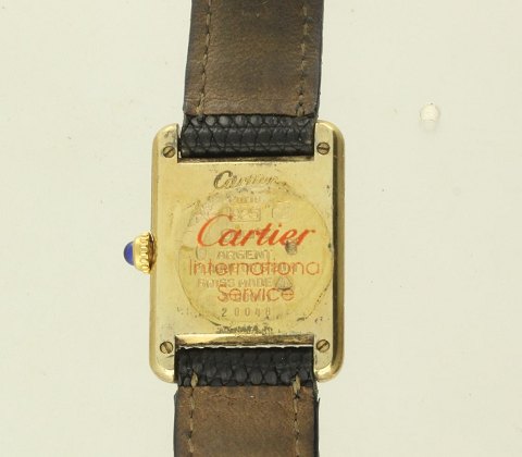 Cartier - Must de Cartier Tank Vermeil i rektangulær urkasse af forgyldt sterling sølv. lyse skive med romertal og rektangulær stregindikation, optrækskrone prydet med chabochonsleben, blå safir. optræks værk. B. ca. 23 mm. Monteret med original Cartier læderrem. Ref nr. 681006.