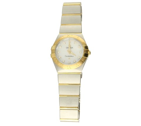 Urkasse af 18 kt. guld og stål, perlemorsskive med brillantbesat punktindeks, guldlynette med romertal, riflet optrækskrone med logo, safirglas, monteret med original lænke af 18 kt. guld og stål, quartz urværk. Ø. 24 cm.