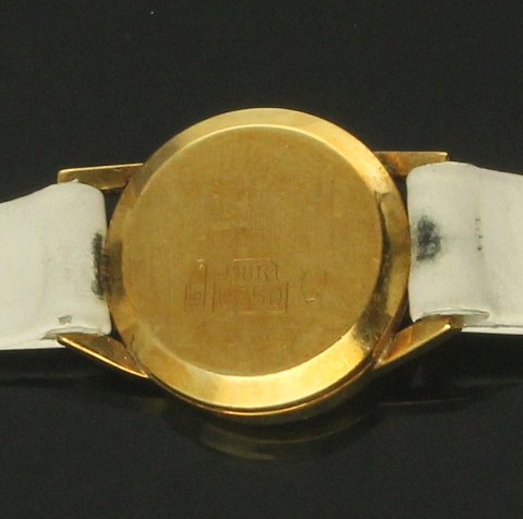 Vintage damearmbåndsur med i urkasse af 18 kt. Gylden urskive med stregindeks, time- og minutviser. Monteret med hvid læderrem. Mekanisk urværk med manuelt optræk. Urkasse diameter: 16,9 mm uden krone. Samlet vægt: ca. 10,73 gr. Bagkasse stemplet 18K, 750.