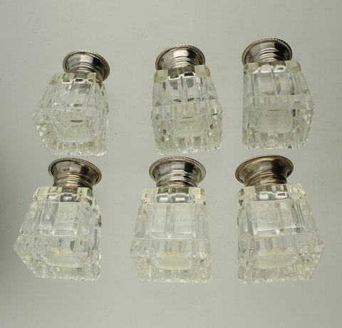 Seks saltbøsser af glas med låg af sterling sølv. Stemplet 925S. H. 5 cm.