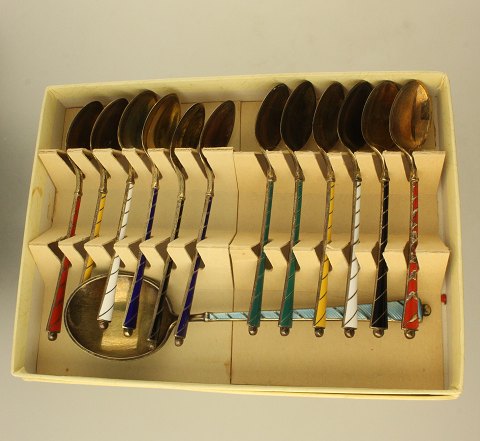 Ela Danmark - 12 mokkaskeer samt 1 marmeladeske udført af sterling sølv og emalje. Samlet vægt: ca. 111 gr.