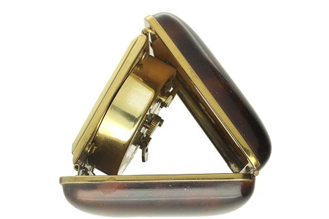 Uret måler 7x6,5x7cm og har en kasse af forgyldt metal i etui af brun plast. Uret har en gylden skive med arabertal.