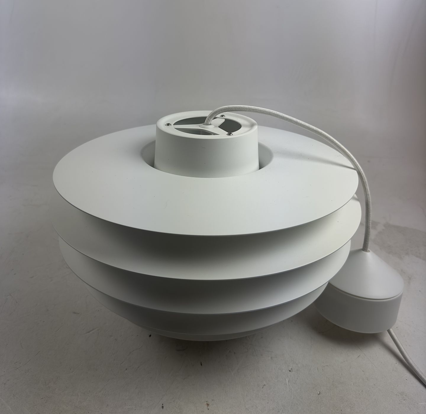 Sven Middelboe for Lyfa - Verona pendel udført af hvidlakeret metal, monteret med hvid stofledning. H. 22 cm. Ø. 32 cm. Nypris: 4.499 kr. Fremstår som ny.